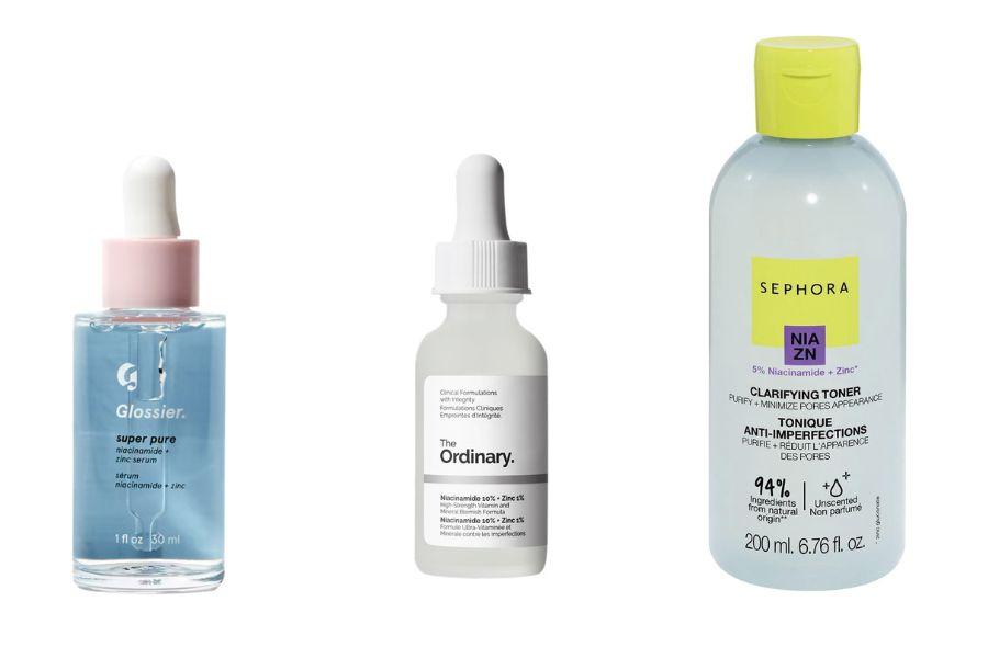 Glossier Super Pure Serum, ₹3,600, for 30ml; The Ordinary Niacinamide 10% + Zinc 1%, ₹600 for 30ml; Sephora Clarifying Toner With 5% Niacinamide and Zinc, ₹1,800 for 200ml