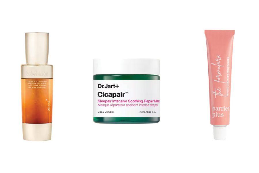 Sulwhasoo Concentrated Ginseng Rejuvenating Serum, ₹15,000 for 50ml; Dr.Jart+ Cicapair Sleepair Intensive Soothing Repair Mask, ₹3,550 for 75ml; Formularx Barrier Plus Peptide Ceramide Moisturiser,₹699