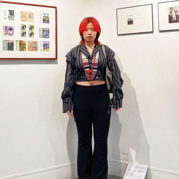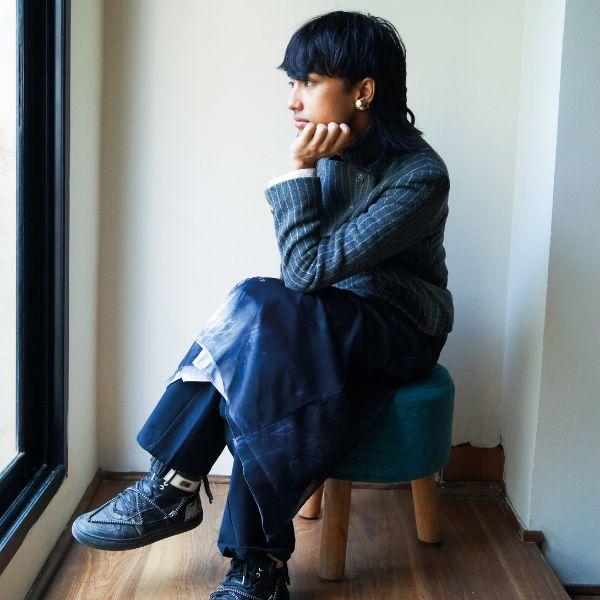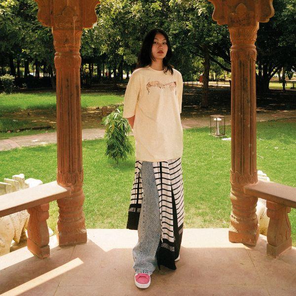 Growing up in Delhi after her family relocated from Guwahati, Khongsai feels like a third culture kid, caught in between two places. “I get very conflicted,” she admits. “This made me want to focus on young people like me from the Northeast, and our style.” In a shoot for the streetwear brand Loko Culture, she styled traditional wraps from the Kuki-Chin-Mizo tribes like the hmar puon as a front-open skirt paired with denims or pleated the mara puan into a sari skirt.
