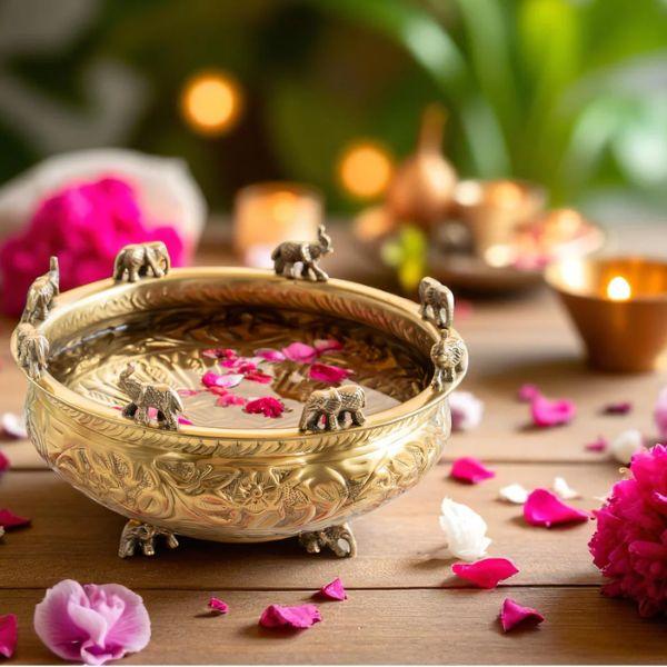Indian Art Villa Pure Brass Embossed Design Urli with Elephant Statue, ₹2,795