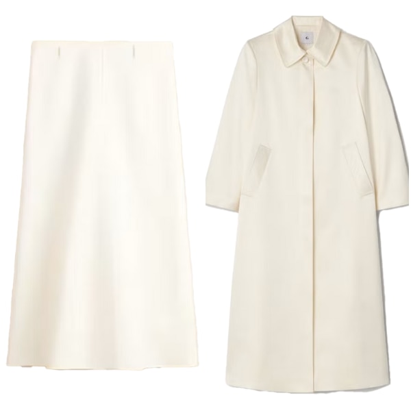 Satin is inherently elegant and a touch precious, and choosing it in white suggests a certain confidence. Lean into that softness and the coat’s subtle retro shape by keeping the palette monochromatic. Accessories like a rounded square-toe heeled loafer add an elegant, yet classic note that feels intentional rather than overly styled.