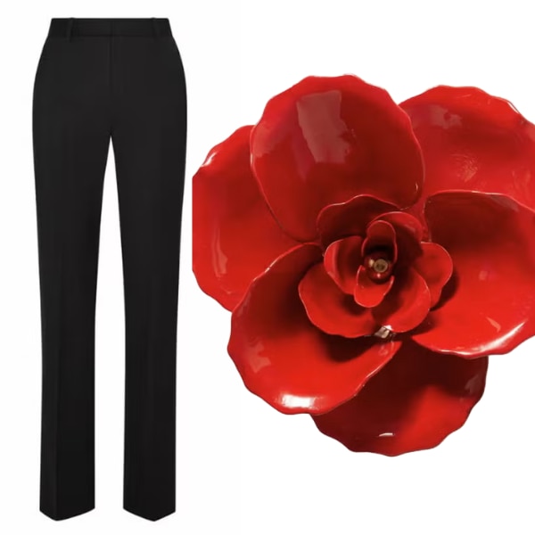 A white tuxedo jacket carries the same formality as its black counterpart, but with an element of disruption that feels novel. Centring the outfit around white allows every other detail to register more clearly. Straight-leg black trousers feel elevated, a red brooch becomes more saturated, and a sequin evening bag reads with extra dimension.