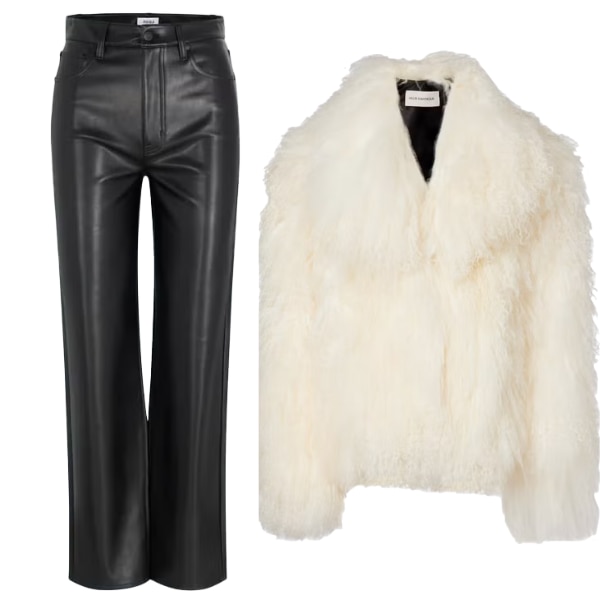 Textural contrast is one of the easiest ways to create interest in an outfit. A shearling jacket brings warmth and a hint of glamour, while glossy leather pants and boots introduce a subtle rocker edge. To keep the look grounded and genuinely winter-appropriate, layer in a cashmere knit and a beanie for balance.