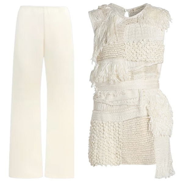 White works beautifully for the evening, especially in fluid satin that reflects light and creates movement. To keep the look from feeling overly polished, temper the shine with a substantial cashmere coat and a patchwork knit top. The mix adds depth and makes the outfit feel effortless rather than precious.