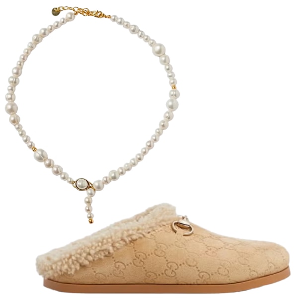 White clothing, and pearls by extension, are often treated as fragile or reserved for special occasions. Push back against that idea by styling a contemporary pearl necklace with relaxed separates. Finish the look with a plush shearling slipper that feels indulgent but far from domestic.