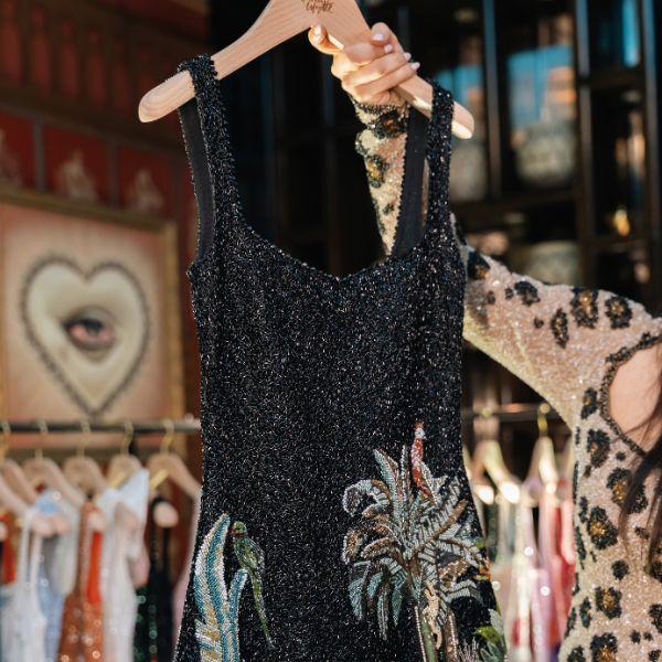 Clio Peppiatt: I learned traditional embroidery techniques from both my grandmother and my mom. These are skills that have been passed down through the women in my family. They’re the whole reason behind the brand. So each piece starts with my hand drawings. When I’m drawing the motif to scale, I’m drawing it in the type of beads or embellishment I imagine. Then I play a very active role in choosing each embroidery material, the colour, etc. So rather than working with an embroidery designer on that aspect, I oversee the whole process, and there lies the identity of the brand. Then, as you mentioned, there’s a synergy with India. The country has such a rich heritage of traditional craft and is the very best place in the world for the embroidery and beading techniques that we work with as a brand. And with that in mind, the atelier we partner with has this same mission of protecting craft, which has really been the most important partnership for me and for the business to date.