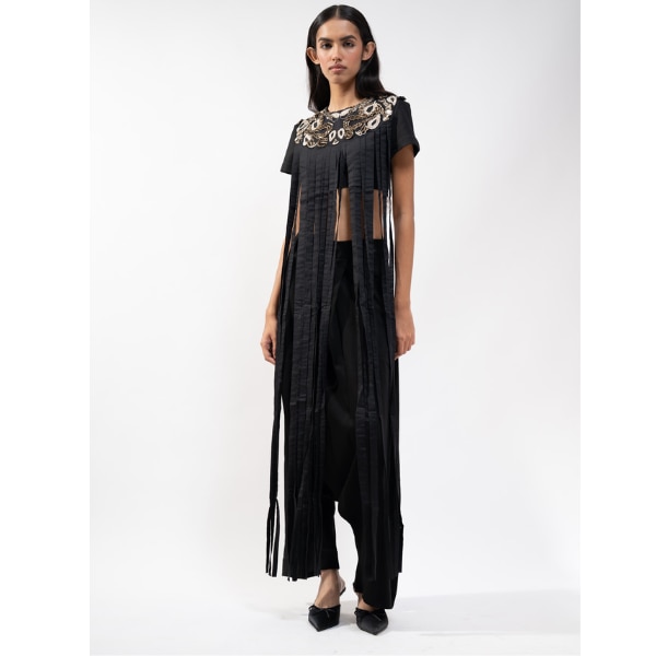 Elsewhere, fringe appeared softened, sharpened, or entirely reimagined–layered over tailoring, embedded into tweed, or translated into metallic surfaces. Closer to home, Indian designers are reframing fringe through a distinctly contemporary lens.