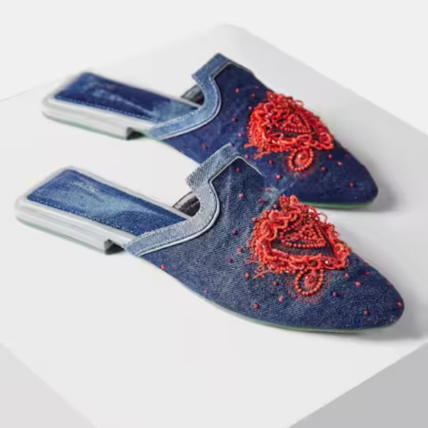 At Jade, denim takes on an unexpected role within luxury accessories and apparel. The label seamlessly merges contemporary materials with traditional Indian craftsmanship, using denim for totes, mules, wedges, and bags adorned with intricate hand embroidery and beadwork. Often paired with vegan leather, these pieces strike a balance between sustainability and indulgence. Denim’s texture and durability make it an ideal foundation for Jade’s handcrafted aesthetic, positioning it as both practical and elevated.