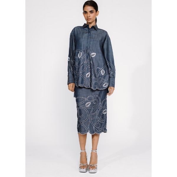 Through his sustainable line AFEW, Rahul Mishra reimagines denim as a medium for artistry and everyday luxury. Indigo bases are elevated with intricate hand embroidery, sequins, and nature-inspired motifs, resulting in flared trousers, kurtas, skirts, and corseted forms. Mishra’s approach transforms denim into wearable art, blending conscious fashion with refined craftsmanship. Each piece reflects his belief that sustainability and beauty can coexist without compromise.