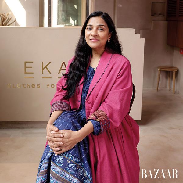 "I hope I am not boring you with an onslaught of information?” Rina Singh pauses as she sifts through 15-odd blocks of all shapes and sizes used in a single block-printed floral motif on a piece of handwoven textile, and asks me. Her reverence for craft and her ‘people’ is beyond obvious as her eyes gleam like a child proud of her treasured toys. How could I, or any other fashion writer, be bored in an interview where you have to hardly look at the prepared questions to tick off the topics of discussion? The brilliant mind behind the textile-led design studio Ekà, Singh, is fresh off the launch of her third retail space in Gurugram, where she unveiled her much-lauded Autumn/ Winter’25 collection, Chamba. Early on in the conversation that started at her store and progressed to her studio, she tells me, “Two languages have established fashion at large—first is couture and the second is glamour. When it is neither, then it takes a while for people to take you seriously, especially when it’s not a basic clothing line.”