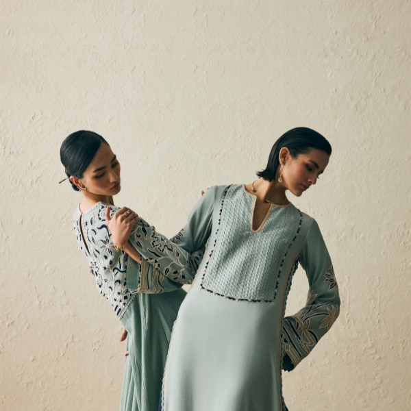 Silhouettes within the collection reflect a careful balance between structure and fluidity, a dialogue that has become synonymous with the brand’s design language. Elongated kurta sets reinterpret traditional forms with contemporary proportions, while coordinated ensembles offer polished options for everyday dressing. Kaftans, with their relaxed drape, emerge as ideal companions for summer travel and resort settings, embodying an effortless sensibility that feels both modern and timeless. Meanwhile, jacket anarkalis introduce a sense of occasion, combining graceful movement with architectural layering.