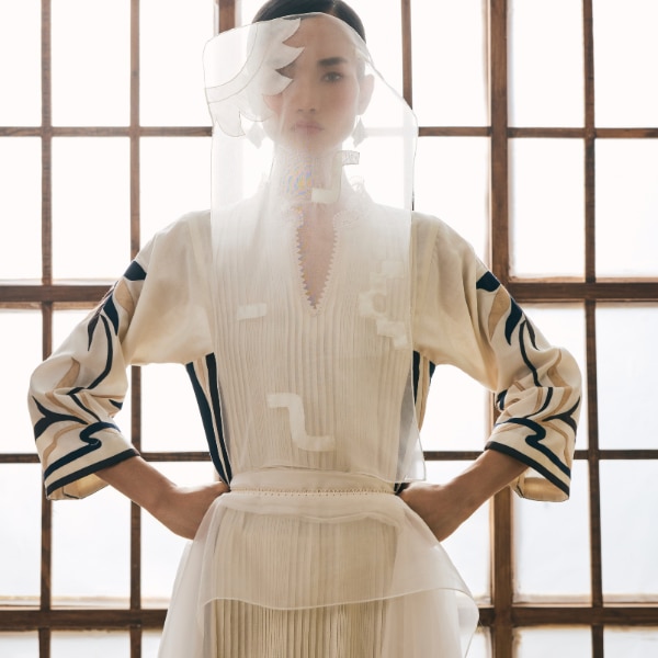 Colour plays an equally thoughtful role. Rather than relying on bold statements, the palette unfolds through soft neutrals and calming tones, think beige, ivory, and sea green. Occasional hints of contrast appear as quiet punctuation within the garments, sharpening the visual composition without disturbing its overall harmony. The result is a restrained yet expressive approach that mirrors the quiet discipline central to Ikebana.