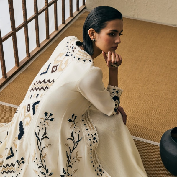 The collection is built around fabrics that naturally lend themselves to warm-weather dressing. Breathable materials such as silk chanderi, airy muslin, and soft cotton form the foundation, allowing each silhouette to move lightly against the body. The emphasis on comfort does not dilute the craft; instead, it heightens the sense of ease that defines the collection. Fine appliqué and delicate dori embroidery trace botanical motifs across the garments, subtly mirroring the linear grace found in floral arrangements.