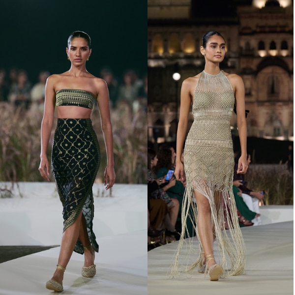 The palace and its guests bore witness to a luxe prêt collection rooted in craftsmanship yet contemporary in silhouette. Each look felt eminently wish-list worthy, with design, fabric, and intention reflecting the brand’s philosophy while complementing the palace’s timeless grandeur. From romantic chiffons and macramé to the bold richness of Benarasi weaves—and even the unexpected introduction of Bermuda shorts reimagined for the Indian runway—the collection struck a balance between personal expression and deliberate design. “In my early twenties, I wore a lot of sheer chiffons and whites, which is reflected in this collection. For motifs, I was inspired by forests, seen in the colours—deep emeralds, midnight blues, and blacks, complemented by ivories, warm golds, butter yellows, and softer, sunlit tones. We worked with Benaras-woven textiles, airy sheers, hand-painted Pichhwai, and delicate cutwork, allowing each technique to breathe rather than overwhelm,” Dongre concludes.
