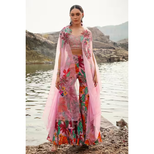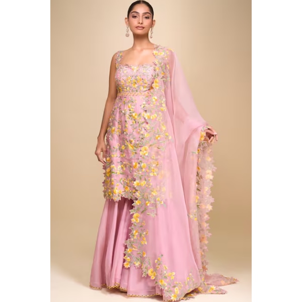 Label Moni K Pink Organza Embroidery, Patchwork Sweetheart Bageecha Bloom Cape And Gharara Set, ₹21,200