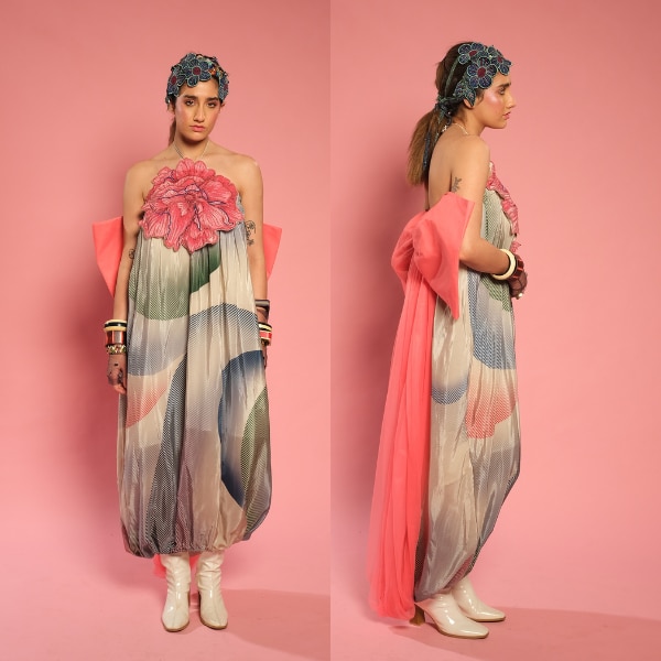 Esha Amin Digital Print Gold crepe, Embellished Flower Halter Neck Bubble Maxi with Detachable Bow Trail, ₹28,000