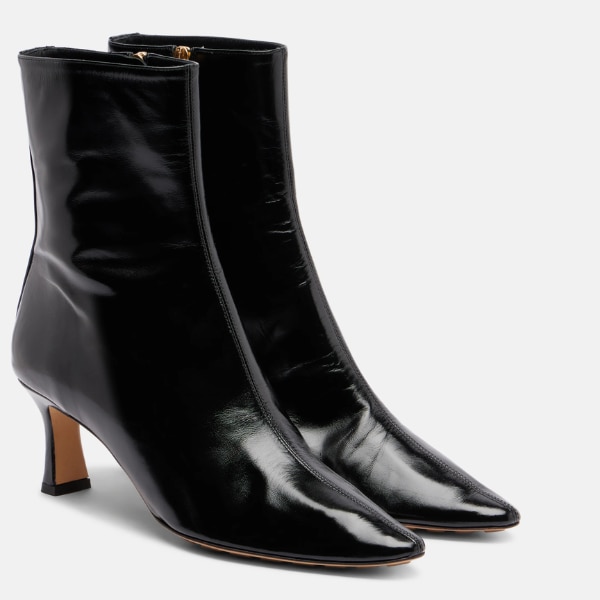 A glamorous ankle boot with a sculpted low heel and a sleek, elongated toe. Wear them with cropped trousers or a slip dress to let the silhouette shine.