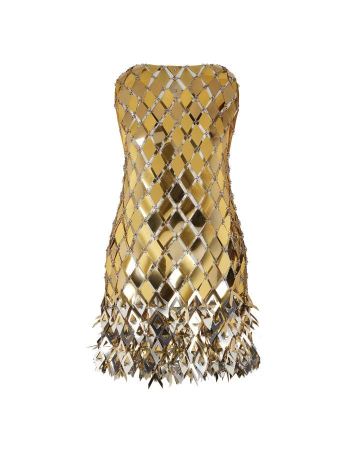 Gold short dress in assembly, Rabanne, ₹3,44,580 approx.