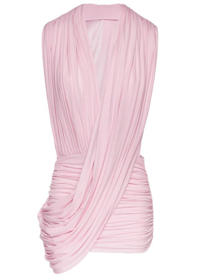 Magda Butrym V neck draped mini dress in pink, ₹1,81,100 approx.
