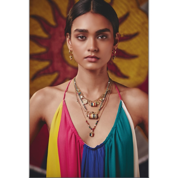 What Arora didn’t want, however, was for a collection to slip into over-ornamented nostalgia.“I wanted to create pieces that honour heritage but sit comfortably in the now, with a kind of lightness and clarity,” she adds. This pursuit of modernity reveals itself most playfully in the charms. “We approached them with a sense of fun,” she smiles. “Nothing overly serious—small, cute and delicate pieces. A little horseshoe that says ‘Jaipur’, a sun emblem recreated entirely through stones that match the Pachranga palette, a lotus rendered in soft enamel, leaves that move when you move. There is a lot of movement, a lot of layering, and that adds to the modernity.”