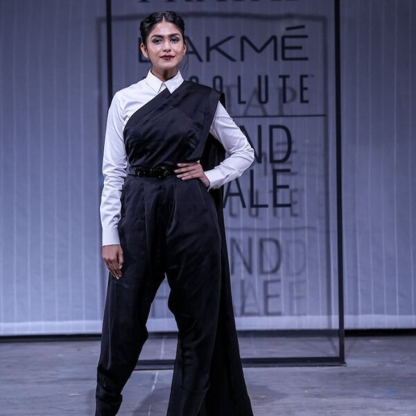 Rajesh Pratap Singh closed Lakmé Fashion Week with a grand presentation of monochromatic outfits set against live opera singers. Think shimmery flowy silhouettes with chunky shoes (and ghungroos), androgynous outfits and of course, Mrunal Thakur’s concept drape-style sari. It was a ‘fitting’ end to the week!
