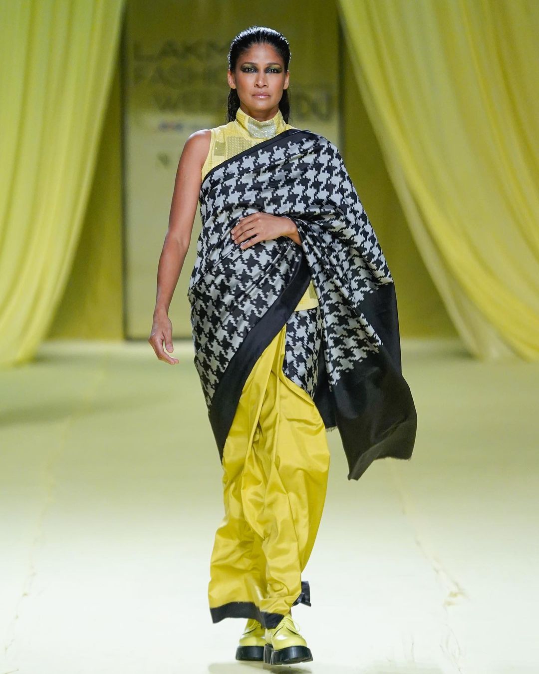 Day three saw redefined resort wear from Guapa, Bloni's deconstructed silhouettes, Amit Agarwal's metallic collection, Limerick's playful prints, and Gauri & Nainika's collection made entirely from biodegradable fabric and so much more. Whereas, day four of LFW saw Gaurang's traditional yet minimalistic saris, Payal Singhal's take on fusion festive dressing in pastel colours, Pankaj and Nidhi's classic silhouettes in vibrant colours, closing with Gaurav Gupta's post-apocalyptic celestial presentation.