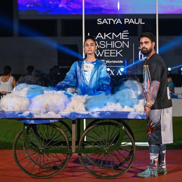 Think models on bicycles and skateboards (and on hand-drawn carts), and clothes with intergalactic prints, Satya Paul closed day two of LFW with a big bang.