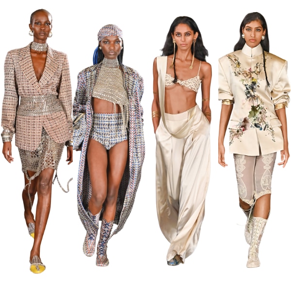 The AK|OK woman this season was centred around ideas of memory, belonging, and longing. A thoroughbred London girl, she visits her grandmother’s house in Rajasthan, where a chance encounter with a stacked away trunk leads her to stumble upon an heirloom that she carries back with herself—eventually turning it into a part of her everyday life in London. Creating a spatial simulation that urges viewers to reckon with memories of their own childhood, down walked Khanna’s runway women whose style is best described as Shoreditch edginess meets Jaipuri elevation. Billowing kaftans, tight-knit corsets, sensuous bralettes, sari-like drapes on dresses with fantastical trails, sculptural blazers with boxer shorts cinched at the waist with belts, chains, and cummerbandhs, Khanna proved yet again that very few designers today are championing Indian craftsmanship for a global audience the way she is. Her collection, peppered with ajrakh prints and chikankari embroidery, styled with stacked silver bracelets and Amazon warrior princess-like braids, gave us an image of modern Indian femininity that was as rooted as it was fantastical.