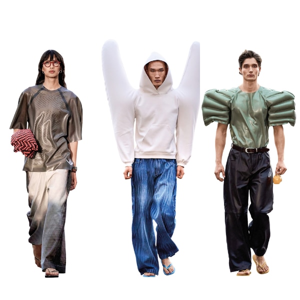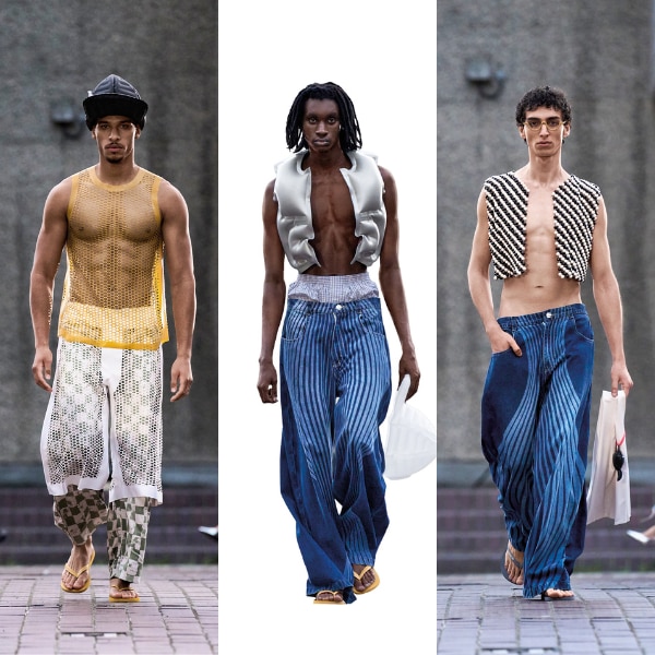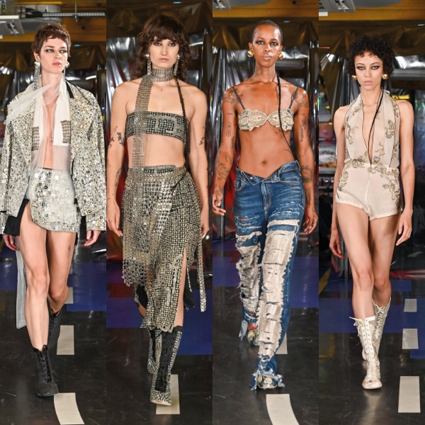 And, behold! To the bass beats of drums and cymbals, Harri’s Museum Wear unfolded as models walked down the winding runway in a series of bomber jackets, overcoats, inflated vests, and gilets in the designer’s signature monochrome latex. Interspersing the previous seasons’ shades of white and black with a deliciously sensual chocolate-brown hue, these latex pieces were paired with dyed and printed denim jodhpurs—tied together with belts that cheekily spelt the designer’s initials along the natal cleft. Further dimensions to this collection came from sheer, beaded tops, latex tote bags, Labubu-like inflated latex charms, and several micro-bags made from inflated latex, in shades of orange and pink.