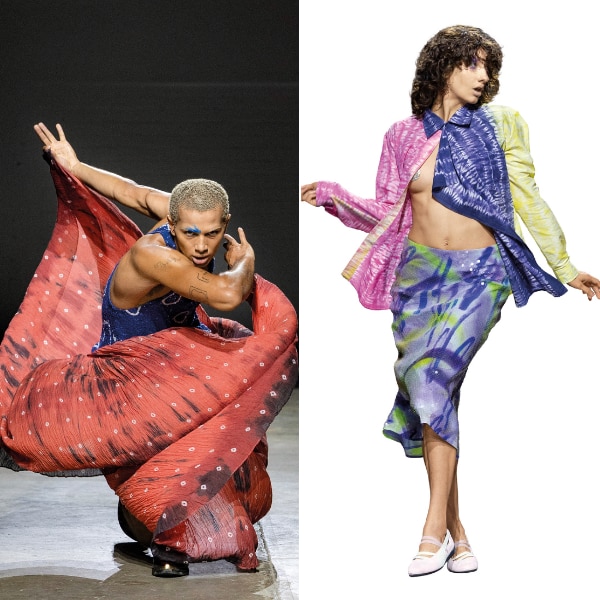Titled Fresh Hell, Ashish juxtaposed the hellish experience of waking up to flooded inboxes, saturated algorithms, and troubling DMs with his signature sequins—this time paired with envious swathes of bandhani fabrics in shades of baby pink, royal blue, citrus yellow, and white. Celebrating 20 years of his eponymous label, the maestro returned to the runway with his usual bunch of misfits and outsiders who waltzed down the runway swinging their bodies to the beats of a soundtrack that had everything—from Doordarshan’s signature title track to EDM. There were ruffled dresses, fringe cuts, diaphanous lungis, unbuttoned shirts held together by the skimpiest of ties at the collar, bandhani-patterned, and sequin embroidered tops with shimmering boxer briefs as his models bent down with the torturous troubles of our times congregated at the centre of 180 Studios to vogue their way through a carefully choreographed and synchronised dance movement.