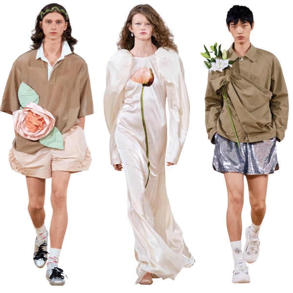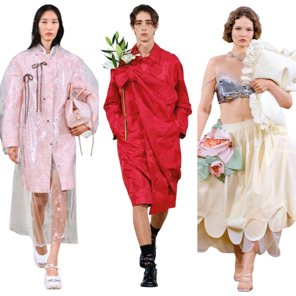 With the designer’s signature crinolines still in place, this season her models walked in sequin-drenched, sparkly bra tops, gauzy hoop skirts, PVC raincoats, panniers, and even bloomers, with some pieces carrying pleasant Easter eggs like the designer’s Chinese name embroidered on the waist in Mandarin. Rocha also exhibited an almost Marc Jacobs-like understanding of toying with colour. In a collection that was predominantly conceived in shades of lime green, pink, and floral pastels, a red pair of trousers was followed by a set of red arm-length gloves, which eventually morphed into a full-length structured blazer on a man with floral details for buttons. It was a breathtaking vision, only further exacerbated by the creative inclusion of pillows and pillow-like bags on the models’ hands, edged with broderie anglaise.