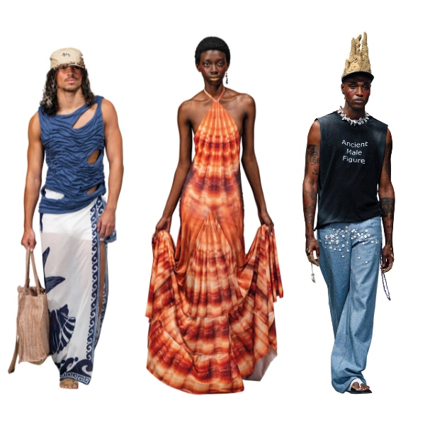 Models (their limbs caked with wet, red mud) walked in T-shirts with cheeky slogans like “Ancient Male Figure”, “Imitation Poseidon”, “Angel of Athens” and my favourite “Fragmented Athena”—with deliberate signs of ripping on the T-shirt’s already-stretched fabric. Paired with trailing sarongs, sand-yellow tote bags with fringes and seashell strings as charms, this collection was Petsa reclaiming her Grecian origins on her own terms. And presenting to her global patrons, a highly covetable, deeply sensuous, and starkly commercial resortwear that never dilutes the core design ethos of her brand.