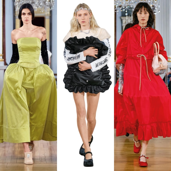 Inspired by a 1992 essay by Maureen Freely about a girl who was extremely unhappy to wear her mother’s clothes, Simone Rocha’s runway of “disgruntled debutantes” was a sharp detour from the dark romanticism that pervaded her collection last season. Taking fodder from her own experiences of trying to fit into her mother’s clothes in her growing-up years, Rocha sent down a series of cross-armed, barely-happy-looking models down the runway to a bonkers soundtrack that went from Salem and White Ring tracks to Doris Day classics like Que Sera.