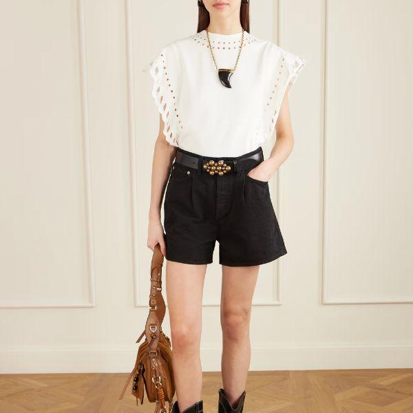 In tops, designers often play with scale, using oversized eyelets or geometric embroidery to create a more graphic effect. Layering also adds dimension. Worn under blazers or paired with sleek outerwear, broderie tops soften sharper looks without diluting their impact. This balance–romantic yet grounded–is what makes them wardrobe staples rather than seasonal novelties.