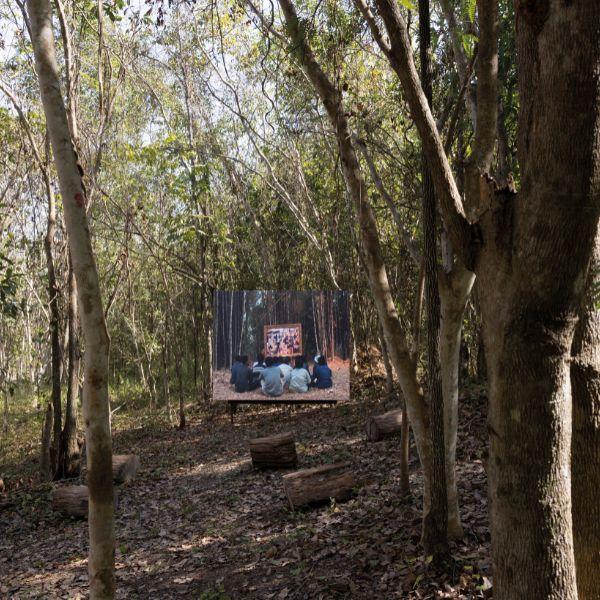 Described by some as an ‘open-air museum’, artworks in this space only find their place if nature offers an opening. One may happen upon a clearing along a winding path through the terrain, only to find a video work by one of Southeast Asia’s most respected contemporary artists, Araya Rasdjarmrearnsook. In her Two Planets Series, a group of people (locals, farmers, workers, monks) encounter masterpieces such as Le Déjeuner sur l’herbe by Édouard Manet or The Gleaners by Jean-François Millet, for the first time, and discuss their impressions while huddling up. Watching the group study the painting, hearing their laughter and conversation, draws the visitor into a layered act of looking. The work subtly shifts the point of focus: who is observing, and who becomes the subject? “In Araya’s work, the curatorial act consisted of finding a natural opening in the forest that allowed us to install the screen,” explains Pansera.